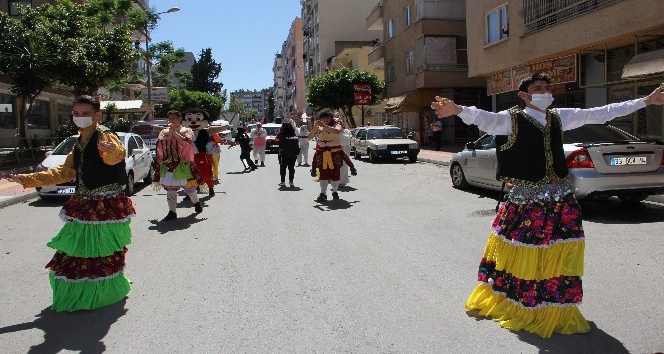 Mersin’in merkez Akdeniz ilçesi Nusratiye Mahallesi Muhtarı Mehmet Dindar, korona virüs (Covid-19) salgını nedeniyle bu yıl Ramazan Bayramı’nda evlerinden çıkamayan mahalle sakinleri için sosyal bir projeye imza attı. Yetkili birimlerden aldığı izinle mahalle sakinlerine güzel bir bayram hediyesi vermek isteyen Muhtar Dindar, mahallenin gençleriyle farklı bir etkinlik düzenledi. Başta Aşuk ile Maşuk ve çengi olmak üzere çizgi film ve masal kahramanlarının kılığına bürünen yaklaşık 25 genç, çalan müzik eşliğinde sokak sokak gezdi. Beyaz tulum giyen gençlerin mahalle sakinlerine bayram şekeri dağıttığı etkinlikte, Aşuk ile Maşuk ve çengiler de yürüyüş boyunca oynadıkları oyunlarla mahalle sakinlerini coşturdu. Müzik sesiyle balkonlara ve pencerelere çıkan vatandaşlar büyük bir mutluluk yaşarken, bazıları da gençlere şeker ve çikolata attı. Kimi mahalle sakinleri müziğin ritmine kapılarak balkonlarında oynarken, gitar eşliğinde gençlerin söylediği şarkılara da eşlik ettiler. 65 yaş ve üstüne bugün verilen sokağa çıkma izninden yararlanarak dışarıya çıkan yaşlılar da müziğe dayanamayarak sokakta gençlerle birlikte oynadı. Gösteriyle güzel bir bayram sürprizi yaşayan mahalle sakinleri, mutluluklarını ‘En büyük muhtar bizim muhtar’ sloganları atarak gösterdiler.