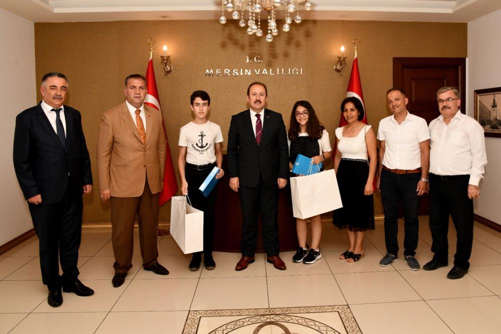 Liselere Geçiş Sistemi (LGS)’de Türkiye birincisi olan Barbaros Ortaokulu öğrencisi Muhammed Ağırman ve Fazlı Kalaycı Ortaokulu öğrencisi Beril Alkım Üren, İl Milli Eğitim Müdürü Adem Koca ile birlikte Mersin Valisi Ali Hamza Pehlivan’ı ziyaret etti.